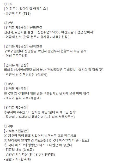 먼저 1부는 TBS 류밀희 기자의 '이 정도는 알아야 할 아침 뉴스'로 꾸며진다.