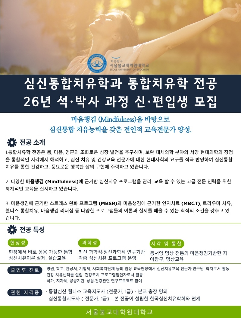 [한국정경신문=서재필 기자] 서울불교대학원대학교(총장 황동필) 통합치유학전공 2026학년도 석·박사과정 신입생 및 편입생 모집에 나선다. 국내 유일의 통합치유학전공은 ‘마음챙김(Mindfulness)’을 바탕으로 심신통합 치유능력을 갖춘 전인적 교육 전문가를 양성하는 것을 목표로 하고 있다.서울불교대학원대학교 통합치유학전
