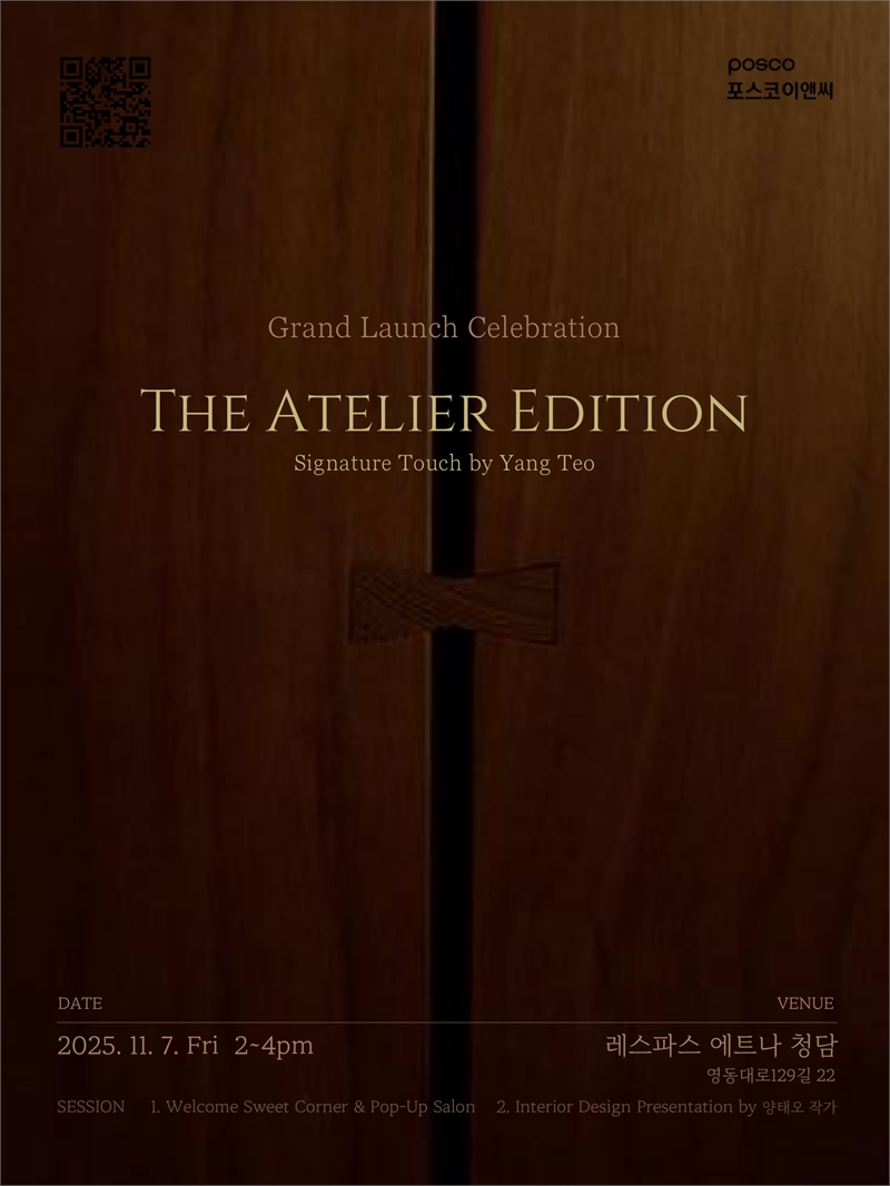 [한국정경신문=이진성 기자] 포스코이앤씨는 세계적인 인테리어 디자이너 양태오 작가와 개발한 하이엔드 인테리어 상품 ‘아틀리에 에디션(The Atelier Edition)’을 다음달 7일 서울 레스파스 에트나 청담에서 론칭 행사를 열고 공식 공개한다고 20일 밝혔다.이번 상품은 포스코이앤씨의 하이엔드 주거 브랜드 '오티에르