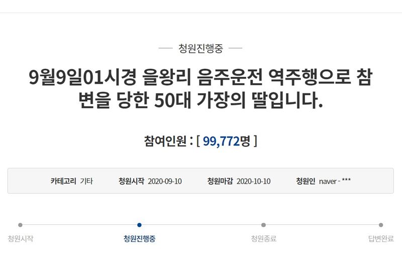 10일 10일 청와대 국민청원 게시판에는 '9월 9일 을왕리 음주운전 역주행으로 참변을 당한 50대 가장의 딸입니다'라는 제목의 청원이 올라왔다. 참여한 인원은 이날 오후 7시 52분 기준 9만 9772명이다.