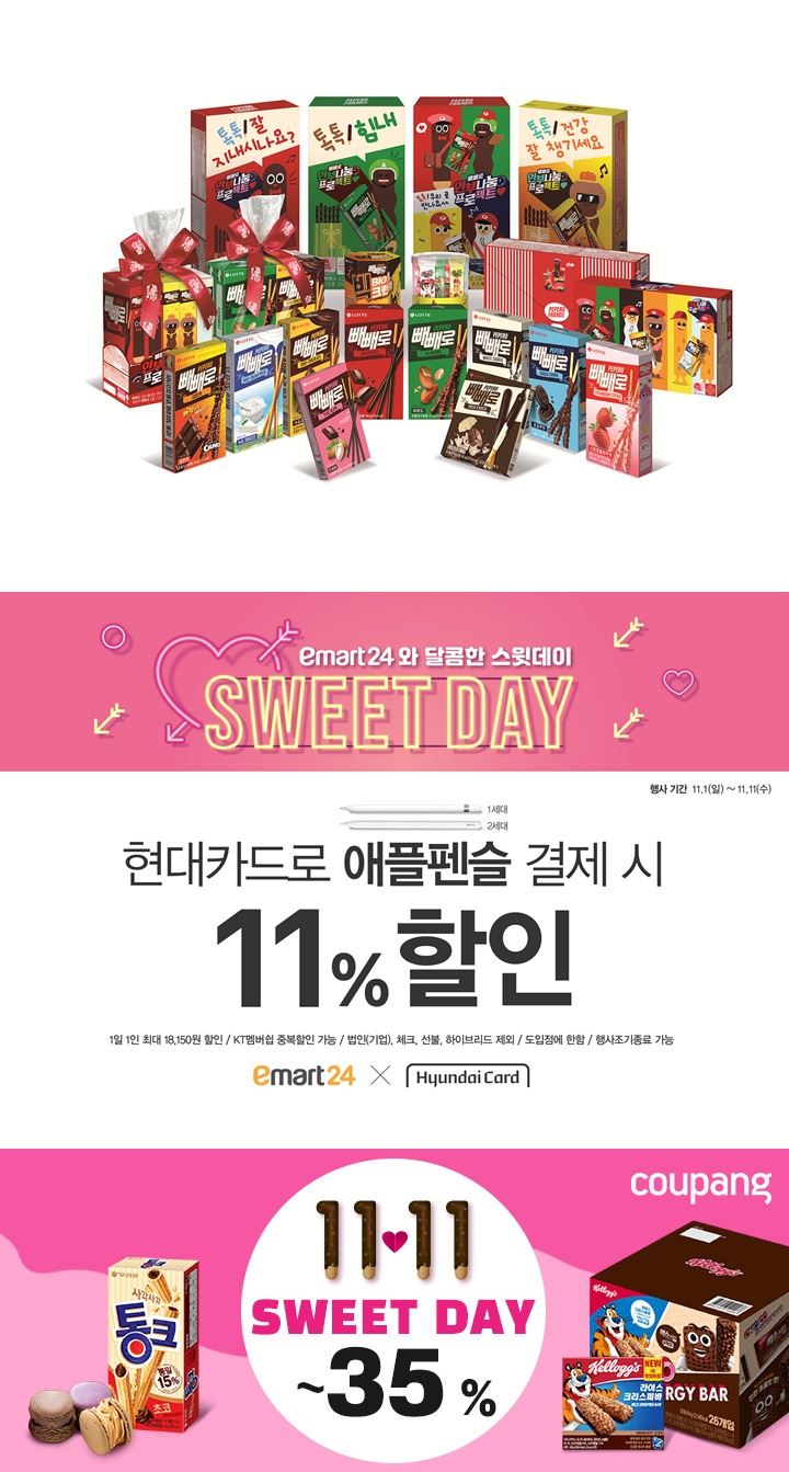 알뜰한 빼빼로데이 구매 행사도 진행한다. 이달 11일까지 롯데빼빼로 전(全)상품을 BC카드로 결제 시 20% 할인, 페레로로쉐 2종(T3, T5)을 카카오페이로 결제 시 50% 할인, 이마트24 스윗데이 기획상품을 NH농협카드로 결제 시 20% 할인 혜택이 제공된다.