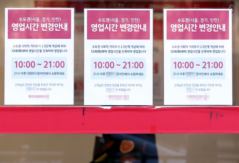 지난 8일 코로나19 확산으로 수도권 사회적 거리두기 단계가 2.5단계로 격상된 첫날 인천시 남동구 한 마트 출입문에 운영시간 축소를 알리는 안내문이 부착돼 있다. (자료=연합뉴스)