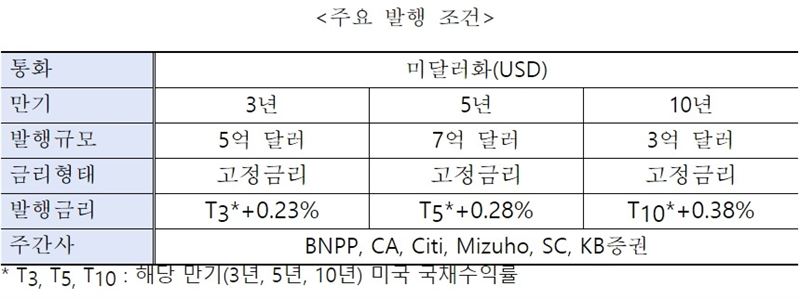 가산 금리는 3년물의 경우 미국 3년 만기 국채 금리에 0.23%, 5년물은 미국 5년 만기 국채금리에 0.28%, 10년물은 미국 10년 만기 국채금리에 0.38%의 가산금리를 더한 수준에서 결정됐다.