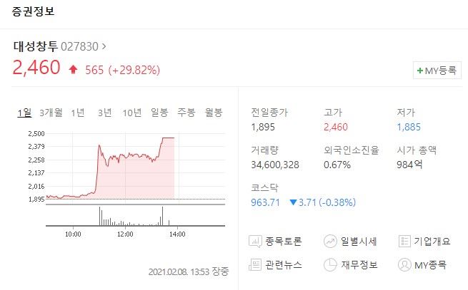 8일 한국거래소에 따르면 대성창투(대성창업투자)는 이날 오후 1시 53분 장중 2460원에 거래되고 있다. 이는 전 거래일 대비 29.82%(565원) 올라 상한가를 기록한 값이다.