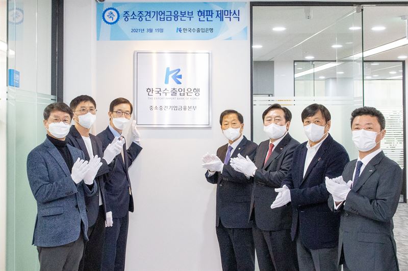 수은은 15일 중소중견기업금융본부를 서울 여의도 중소기업중앙회 건물로 이전했다고 밝혔다. 이날 열린 현판 제막식에는 방문규 수은 행장, 윤후덕 국회 기획재정위원장, 김기문 중소기업중앙회장, 장승국 소부장 강소기업 100 협의회장 등이 참석했다.