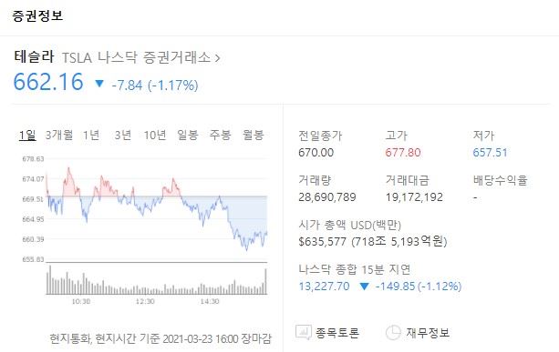 23일(현지시간) 나스닥 증권거래소서 테슬라 주가는 662.16 포인트에 거래를 마쳤다. 이는 전 거래일 대비 7.84(1.17%) 떨어진 값이다.