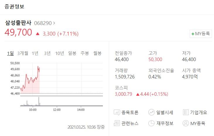 25일 한국거래소에 따르면 삼성출판사는 오전 10시 36분 장중 4만 9700원에 거래되고 있다. 이는 전 거래일 대비 7.11%(3300원) 오른 값이다.
