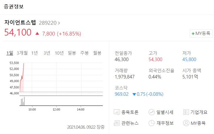 6일 한국거래소에 따르면 자이언트스텝 주가는 오전 9시 22분 장중 5만 4100원에 거래되고 있다. 이는 전 거래일 대비 16.85%(7800원) 오른 값이다.