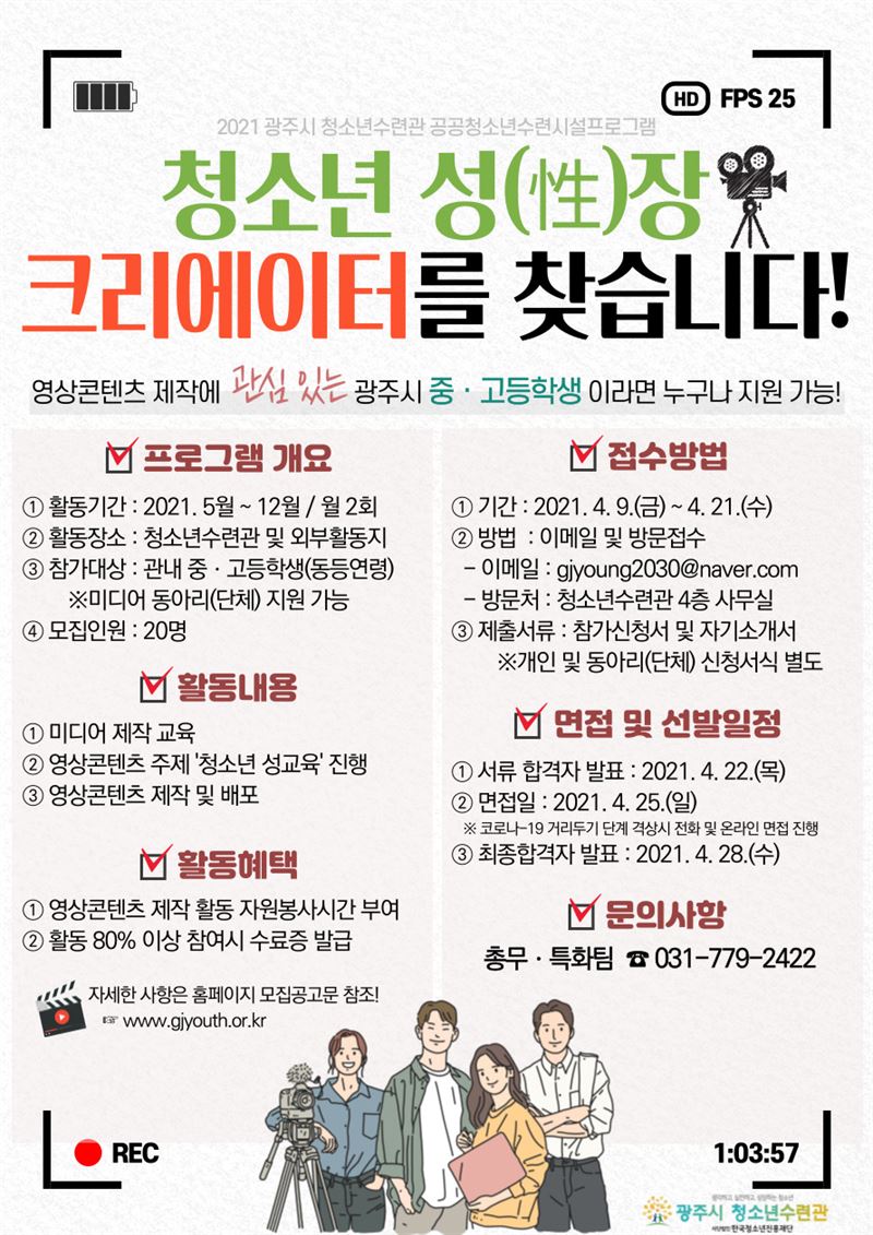 경기도와 광주시가 함께 지원하는 이번 프로그램 참가자들은 5월부터 12월까지 월 2회 활동하게 되며 미디어 제작 교육과 더불어 기존 청소년 성교육 시스템에 대한 문제점 탐색 및 해결방안을 고민하는 시간을 갖고 이를 바탕으로 청소년 눈높이에 맞는 청소년 성교육 콘텐츠를 제작해 청소년들에게 배포할 예정이다.