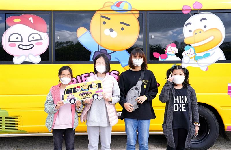 카카오프렌즈 캐릭터들로 '래핑'된 버스가 지역 아동이 있는 곳을 찾아가 4차원(4D) 가상현실(VR) 게임 문화 체험의 기회를 제공한다.