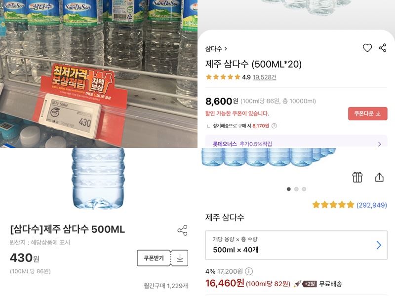 우선 정말 최저가인지 확인에 나섰다. 상품은 소비자들이 가장 많이 찾는 제품 중 하나인 생수 ‘삼다수(500ml)’로 한정한다. 26일 오전 이마트 은평점을 방문했을 때 당일 삼다수 500ml 한 병의 가격은 430원이다. 같은 날 롯데마트 은평점도 동일한 가격이었다.