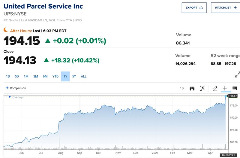 어제 미국 시장 특징주식은 화물 운송 회사인 UPS로 10.42% 상승하여 1년 신고가를 갱신하였습니다. 경기 회복에 따라 운송 능력이 수요를 따라 가지 못하는 상황에서 이 주식도 연말까지 상승세를 보일 것 같습니다. 우리나라에서도 해운주가 고공행진을 하는 것과 일맥상통합니다.