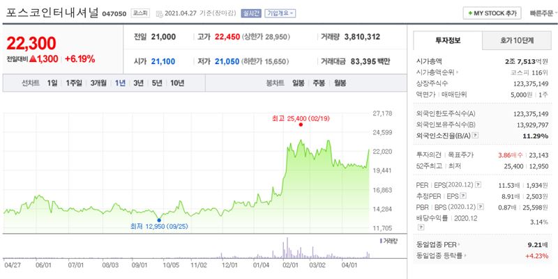 어제 한국 주식시장 특징주가 6.1% 상승한 포스코인터내셔널입니다. 작년까지 평범한 자원개발주식으로서 소위 박스권에 있으나 배당을 많이 주는 안정적인 주식이었습니다. 그런데 올해 자회사가 전기차 모터 코어 및 2차 전지 부품을 본격적으로 생산하면서 2차전지 관련주가 되었습니다. 따라서 안정적인 자산, 배당 및 전기차 부품으로서의 성장성까지 갖춘 그야말로 명품주 직전으로 갔습니다. 그러나 미얀만 군부 사태가 터지면서 그 곳 가스전의 매출 비중이 큰 관계로 2달간 다시 20% 이상 조정을 받았습니다. 다만 가스전 사업이 군부와 직접 관계가 없다는 해명과 현지 사태가 최근 군부 집권을 사실상 막을 수 없는 고착 상태가 되어 안정권으로 들어가면서 어제 연기금 및 기관 외인 양매수로 다시 뛰어 오르고 있습니다.