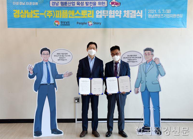 경남도와 ㈜피플앤스토리가 3일 ‘경남 웹툰산업 육성 발전을 위한 상호협력 업무협약’을 체결했다.[자료=경남도청]