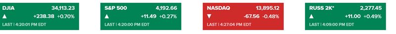 다만 나스닥 시총 상위 기술주들은 장중 상승하다가 소폭 하락으로 마감하였습니다. 애플은 0.82% 상승 마감하였으나 다른 대표 기술주인 마이크로소프트, 구글, 페이스북은 소폭 하락하고 아마존과 테슬라는 각 -2.3%, -3.45% 하락폭이 컸습니다.