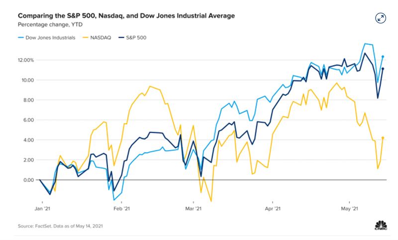 올해 미국 주식시장의 주요 지수를 비교하는 차트입니다. 기술주 위주의 나스닥은 2월까지 많이 오르다가 백신 보급으로 경제가 정상화되고 인플레이션 영향으로 미국 10년치 국채 금리가 오르면서 급격히 하락했다가 다시 반전 그리고 다시 급락 등 롤러코스터를 보여주고 있습니다. 반면 전통주식이 위주인 다우나 S&P500지수는 비교적 순탄하게 계속 오른 것을 알 수 있습니다.