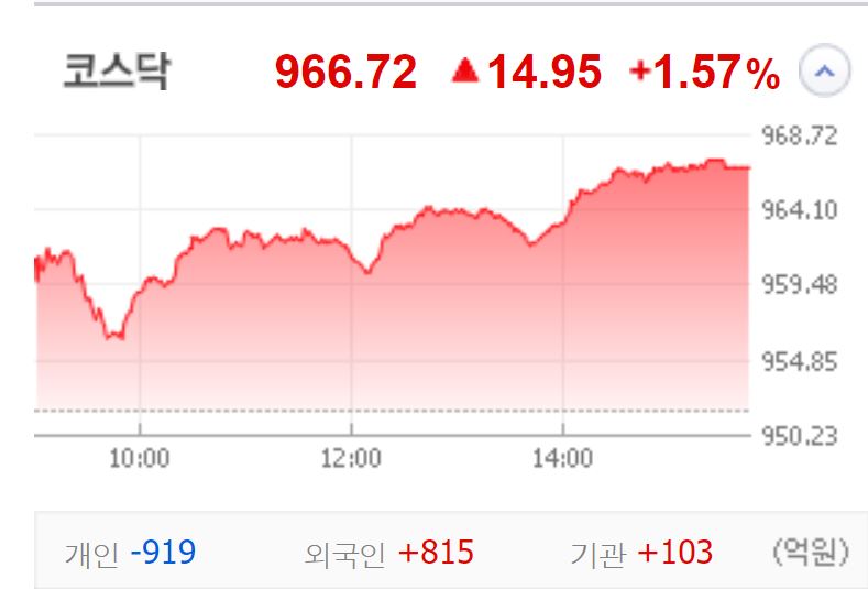 코스닥도 전날 상승했던 펄어비스, 휴젤을 제외하고는 시총 상위 종목들이 다 빨간불로 마감했습니다. 2차전지 관련 에코프로비엠이 4.39% 상승해 상승폭이 컸습니다.