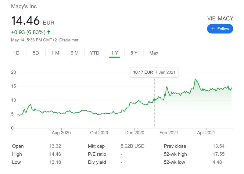 14일 미국 주식시장 특징주입니다. 오랜 역사를 가진 백화점 매시 주가가 전날보다 6.83% 상승했습니다. 경기회복으로 내수주가 활황을 보입니다. 한국도 최근 백화점 주가 상승 분위기입니다.