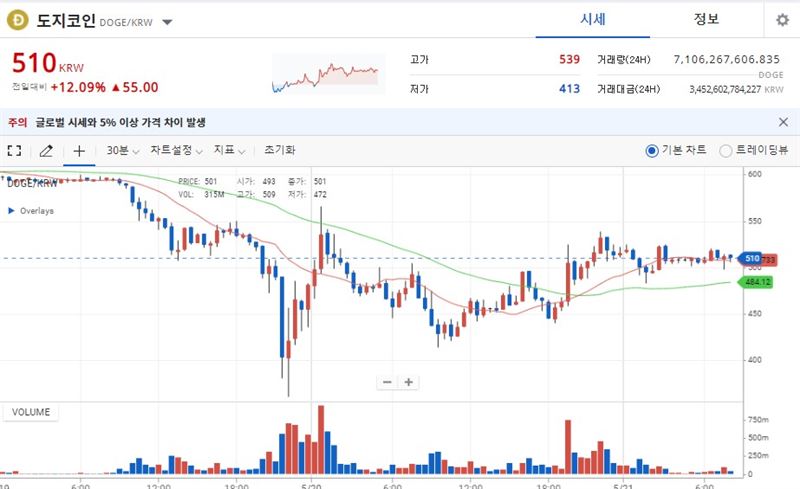 오전 8시 23분 기준 가상화폐 거래소 업비트에 따르면 도지코인 시세는 전일 대비 12.09%(55원) 오른 510우너에 거래되고 있다.