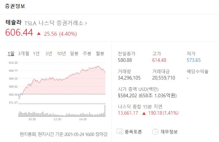 [자료=네이버 증권정보] [한국정경신문=김지연 기자] 테슬라 주가가 올랐다. 24일(현지시간) 나스닥 증권거래소에서 테슬라 주가는 606.44달러에 거래를 마쳤다. 이는 전 거래일 대비 25.56(4.40%) 오른 값이다. 테슬라는 이날 장 초반 하락세로 장을 열었다. 하지만 이내 반등에 성공, 600달러 선을 회복했다. 한편 이날 뉴욕 증시에서는 기술주와 통신 관련주가 1.8%가량 오르면저 주요지수 상승을 주도한 것으로 전해졌다. 0 0 한국정경신문 김지연 기자 koreacuturein@gmail.com 김지연 기자의 기사 더보기 저작권자 <지식과 문화가 있는 뉴스> ⓒ한국정경신문 | 상업적 용도로 무단 전제, 재배포를 금지합니다.