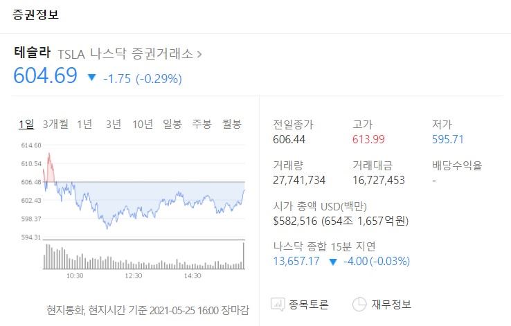 25일(현지시간) 나스닥 증권거래소서 테슬라 주가는 604.69달러에 거래를 마쳤다. 이는 전 거래일 대비 0.29%(1.75) 떨어진 값이다.