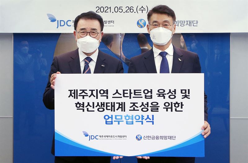 [한국정경신문=이정화 기자] 신한금융희망재단(이사장 조용병)은 26일 서울시 중구 신한금융 본사에서 제주국제자유도시개발센터(이사장 문대림)와 제주지역 스타트업 육성 및 혁신성장 생태계 조성을 위한 업무협약을 체결했다.