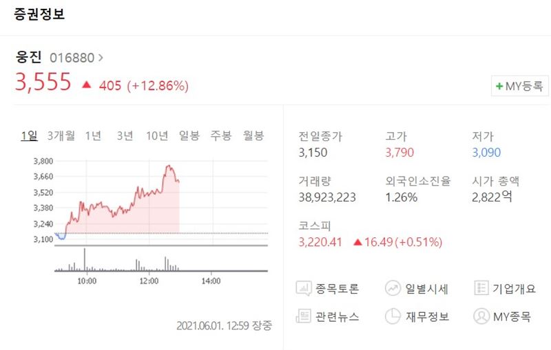1일 한국거래소에서 웅진은 오후 12시 59분 장중 3555원에 거래되고 있다. 이는 전 거래일 대비 12.86%(485원) 오른 값이다.