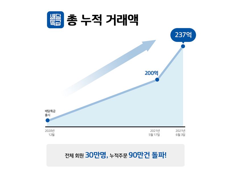 지난 2020년 12월1일 '배달특급' 사업을 시작한지 약 반년 만에 지난해 회사의 총 거래액을 돌파, 꾸준히 상승세를 타고 있는 것이다.