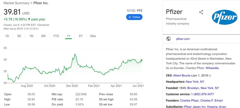 9일 미국 주식시장의 특징주는 화이자로 전날보다 2.47% 상승했습니다. 미국 정부가 5억개의 화이자 백신을 구매해 다른 나라에게 나눠준다는 소식이 호재가 됐습니다. 그러나 1년치 상승분은 16.99% 밖에 안 됩니다. 최근 미국 우량주 대부분은 지난 1년간 100% 안팎 상승했습니다. 제약회사 주식은 안정성이 있어 불황에 떨어지는 폭이 작은 대신 특별한 호재가 없는 한 상승폭도 작습니다. 오늘 화이자 말고 다른 시총 상위 제약회사들 주가도 좋았습니다. 존슨앤존슨, 얼라이 릴리, 노바티스 등도 각 1.35%, 2.40%, 2.83% 상승했습니다. 6월 암 학회를 앞두고 제약, 바이오 부분이 살아나는 분위기입니다. 한국 제약, 바이오 부분도 다시 고개를 들 가능성이 보입니다. 다만 개인투자자들이 제약, 바이오 비중을 너무 많이 가지고 가는 것은 위험성이 많습니다. 25% 이하가 바람직하다고 봅니다.