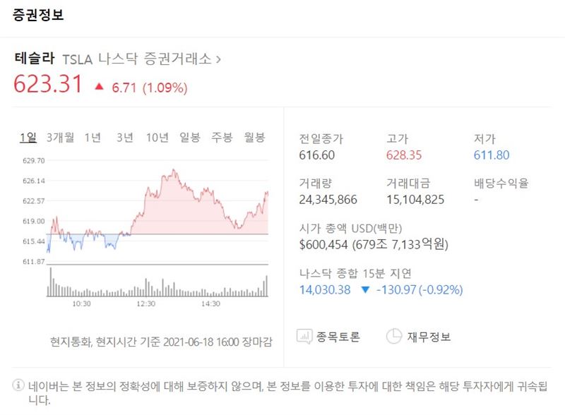 18일(현지시간) 나스닥 증권거래소서 테슬라 주가는 623.31달러로 장을 마쳤다. 이는 전 거래일 대비 1.09%(6.71) 오른 값이다.