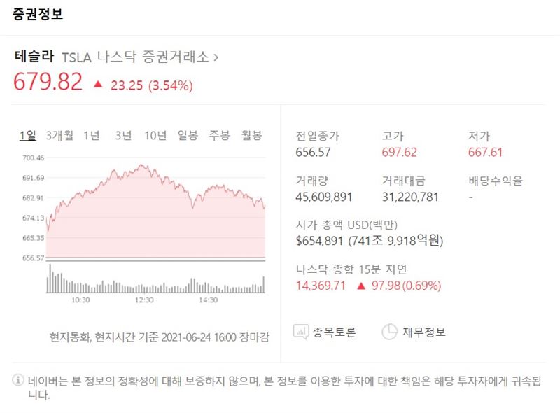 24일(현지시간) 나스닥 증권거래소서 테슬라 주가는 679.82 달러로 장을 마쳤다. 이는 전 거래일 대비 3.54%(23.25) 오른 값이다.