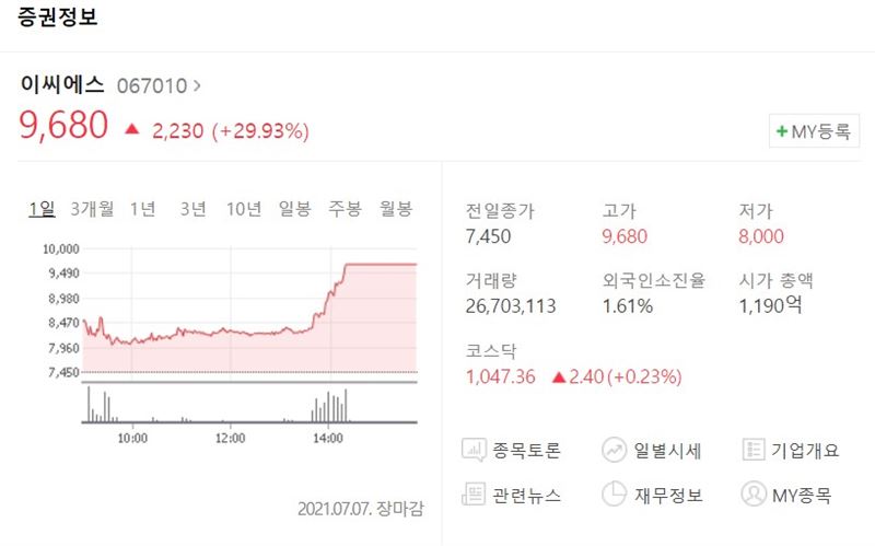 7일 한국거래소에 따르면 이날 이씨에스 주가는 9680원에 거래를 마쳤다. 이는 전 거래일 대비 29.93%(2230원) 올라 상한가를 기록한 값이다.