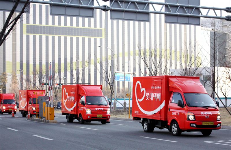 롯데글로벌로지스의 택배차들이 도로를 달리고 있다. [자료=롯데글로벌로지스]