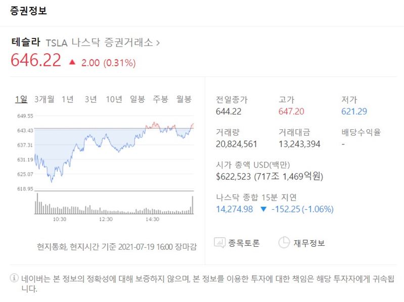 19일(현지시간) 나스닥 증권거래소서 테슬라 주가는 646.22달러에 거래를 마쳤다. 이는 전 거래일 대비 0.31%(2.00) 오른 값이다.