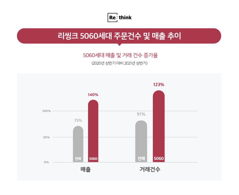 26일 재고전문몰 리씽크에 따르면 실제 5060 고객 주문 건수와 매출이 크게 증가했다. 2021년 상반기(1월~6월)를 기준으로 전체 매출은 전년 동기 대비 약 75% 증가했다. 이에 비해 5060세대의 매출은 약 140% 증가한 것으로 나타났다. 거래 건수 역시 전년 동기 대비 약 91% 증가했지만, 5060세대의 경우 약 123% 늘었다.