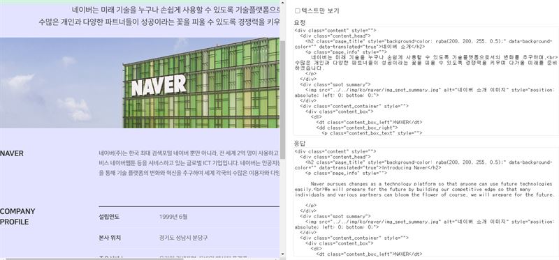 ‘웹 번역 API’는 웹페이지 내 소스 언어로 작성된 HTML 문서를 파파고만의 태그 복원 기술을 반영해 원하는 언어로 번역해준다. HTML 소스 내에 태그와 문장을 분리한 후 발췌된 문장 내용만 번역하고, 완성된 번역결과를 다시 HTML 태그와 조합하여 완성된 형태의 HTML로 보여준다.