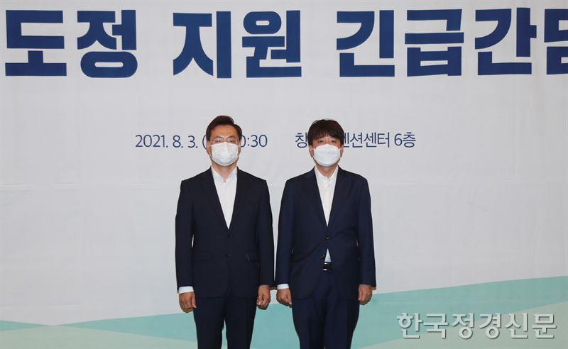 3일 경남도정 지원 긴급간담회에서 하병필 도지사 권한대행(왼쪽)과 이준석 국민의힘 대표가 기념촬영을 하고 있다. [자료=경남도청]
