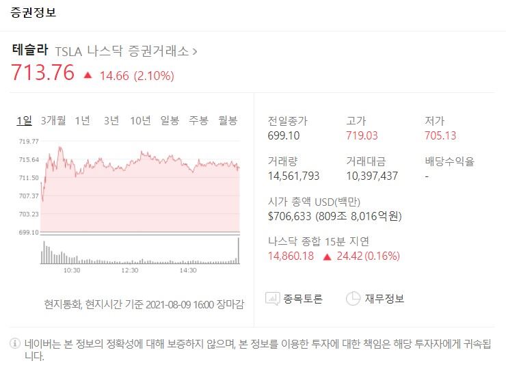 이날 테슬라 주가는 꾸준히 상승세를 유지했다. 장중 한때 고가는 719.03달러, 저가는 705.13달러를 기록했다.