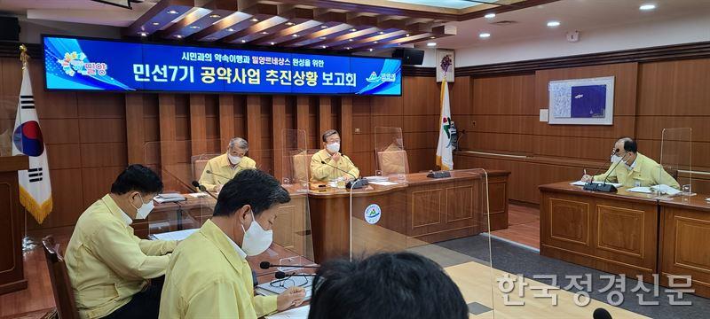 17일 밀양시는 시청 소회의실에서 박일호 밀양시장 주재로 간부공무원들이 참석한 가운데 민선7기 3년 동안 추진한 58개 공약사업을 점검하는 보고회를 개최했다. [자료=밀양시]