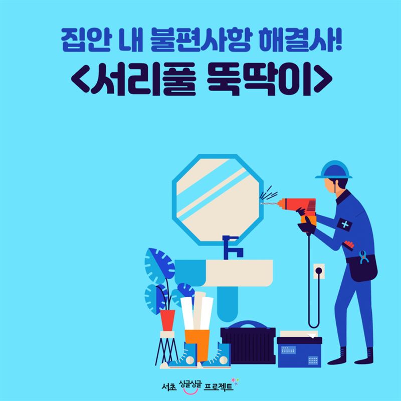 세 번째, 서리풀 뚝딱이는 사소하지만 혼자서는 해결하기 어려운 집안 내 간단한 수리.수선을 지원한다. 일상생활 속 소소하지만 갑자기 발생되는 어려움을 해결할 수 있도록 가구 당 연 10만원 상당 이내의 수리를 지원해 1인가구가 겪는 불편을 최소화 할 계획이다.