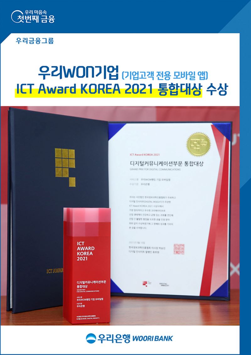 우리은행 기업전용 모바일앱 우리WON기업이 ‘ICT Award KOREA 2021 통합대상’을 수상했다. [자료=우리은행]