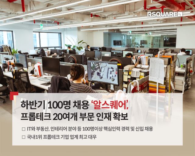 [한국정경신문=이상훈 기자] 프롭테크(Property+Technology) 기업 알스퀘어가 연말까지 IT와 부동산, 인테리어 등 총 27개 부문에 걸쳐총 100명 규모의 신입, 경력 하반기 공개 채용을 시작한다고 밝혔다.