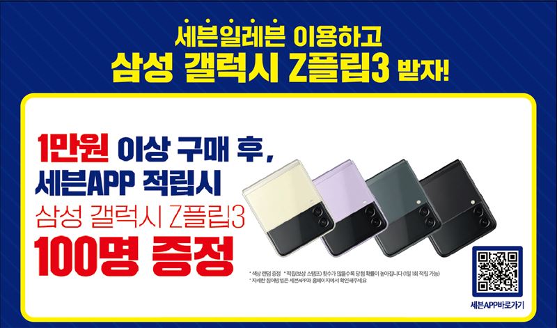 세븐일레븐은 오는 10월 한 달간 1만원 이상 구매 고객을 대상으로 추첨을 통해 총 100명에게 갤럭시Z플립3를 증정한다고 30일 밝혔다.