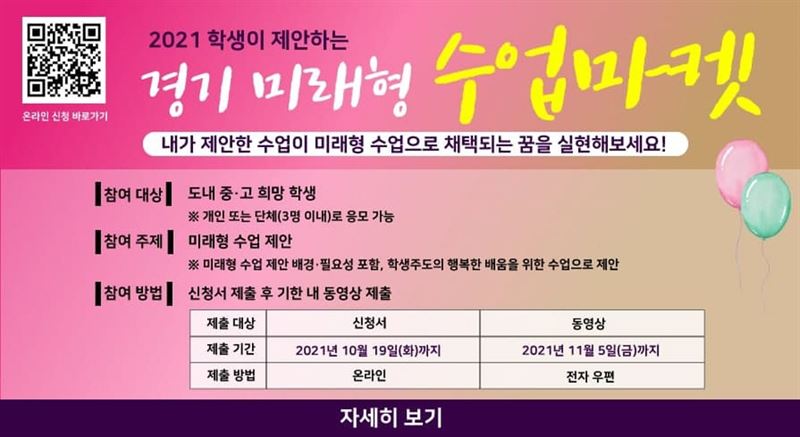 경기 미래형 수업 마켓은 학생이 마음껏 상상한 미래형 수업을 영상으로 직접 제작해 제안하는 학생 주도 참여 행사로 지난해부터 도교육청이 마련했다. 이 행사는 중.고 학생을 대상으로 개인이나 3명 이내로 팀을 구성해 참가할 수 있다.