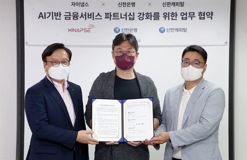 지난 15일(금) 서울시 강남구 소재 자이냅스 본사에서 열린 신한은행, 신한캐피탈과 자이냅스의 AI기반 금융 서비스 파트너십 강화를 위한 업무협약식에서 신한은행 김철기 디지털혁신단장(왼쪽)과 자이냅스 주동원 대표(가운데) 그리고 신한캐피털 정상훈 SI금융 본부장(오른쪽)이 기념촬영하는 모습 [자료=신한은행]