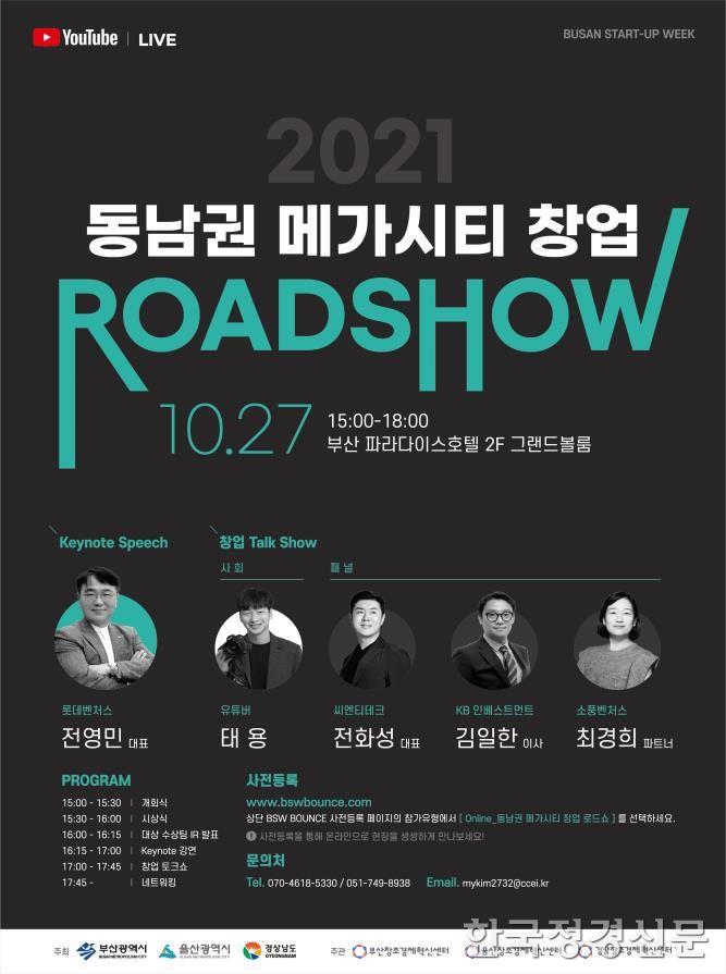 [한국정경신문(부산)=허미화 기자] 부산시(시장 박형준)는 27일 오후 3시부터 파라다이스호텔 부산에서 울산시(시장 송철호), 경상남도(도지사 권한대행 하병필)와 함께 ’동남권 메가시티 창업로드쇼’를 개최한다고 밝혔다.