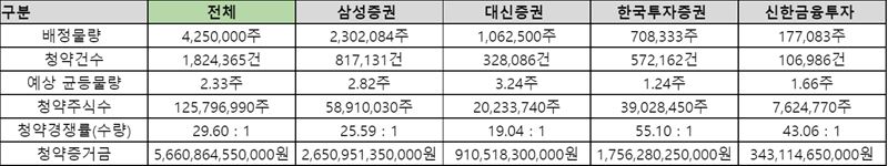 이번 일반청약에서 가장 큰 수수료수익을 얻은 건 삼성증권이다. 공동대표주관사에 이름을 올린 덕에 배정물량을 제일 많이 받았기 때문이다. 또 주식 배정방식이 균등물량 100%고 신청 수가 배정수를 넘지 못했기 때문에 청약건수가 100% 수수료수익으로 잡히게 됐다.