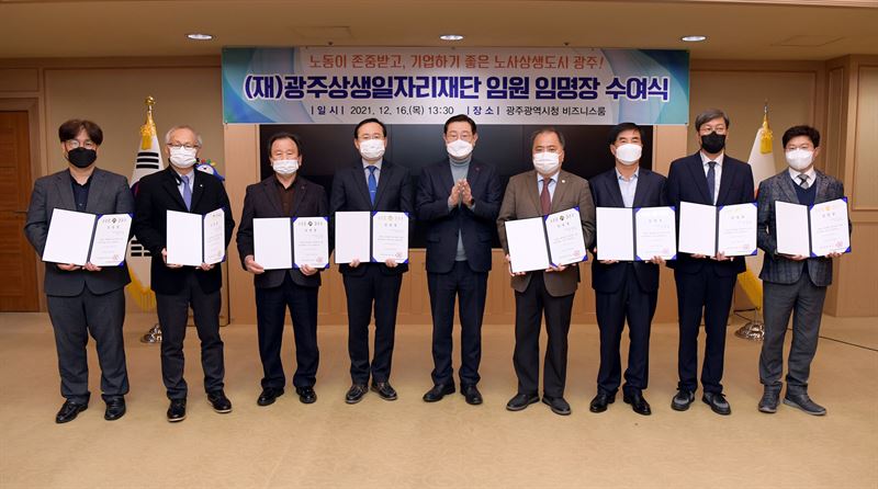 16일 오후 광주시는 시청 비즈니스룸에서 지난 10월부터 임원 공모와 임원추천위원회 심사 절차를 통해 선발된 광주상생일자리재단 대표이사 등 선임직 임원 9명에 대해 임명장을 수여했다. [자료=광주광역시]