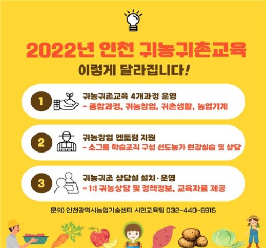 한편 상반기 귀농귀촌교육은 3월부터 실시하며, 자세한 사항은 인천시농업기술센터 시민교육팀으로 문의하면 된다.