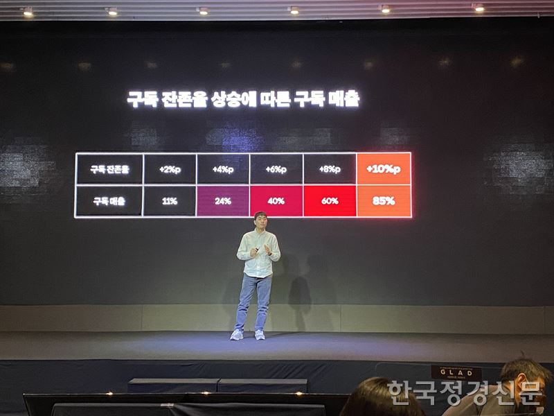 22일 열린 '2022 왓챠 미디어데이'에서 왓챠의 원지현 COO가 OTT 시장의 '구독 잔존율 상승에 따른 구독매출'에 대한 설명을 하고 있다. [자료=송정은 기자]